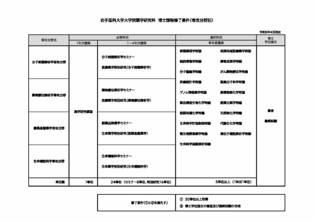 以上の教育成果を達成することができるように博士課程のカリキュラムが構成されています。定められた期間内に所定の講義と実習を受けて(学則第6条と第8条)、最先端の生命科学や薬学知識を学び、卓越した技能を修得することが求められます。主体的に研究者として自立していることを証明するため、研究活動で得られた科学的知見を学術論文として、査読制度のある学術雑誌に掲載し、公表する(あるいは掲載予定として受理される)ことが求められます。国際的に評価される質の高い研究を企画し遂行するためには、しっかりした実験計画の立案と遂行途中での適切な見直しが必要となります。そこで、研究開始時、遂行途中および終了時の各段階で、それぞれ初期審査、中間審査を受けて最終試験に合格することが、学位授与の要件となっています。