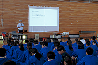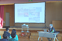 災害とは何かというテーマで講演を行った。生徒からは、実際に災害が起きた際の避難方法について質問が寄せられた。